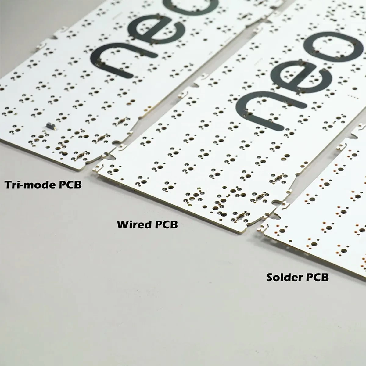 Qwertykeys Neo80 PCB is available in three options: Tri-mode Hotswap, Hotswap Wired, Solder Wired. These PCBs may be purchased to complete a full kit or purchased separately as extras.