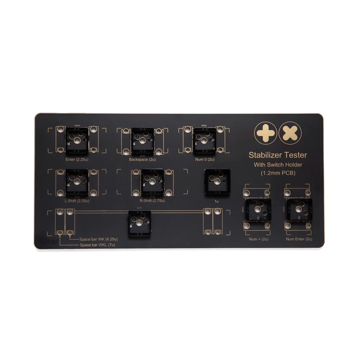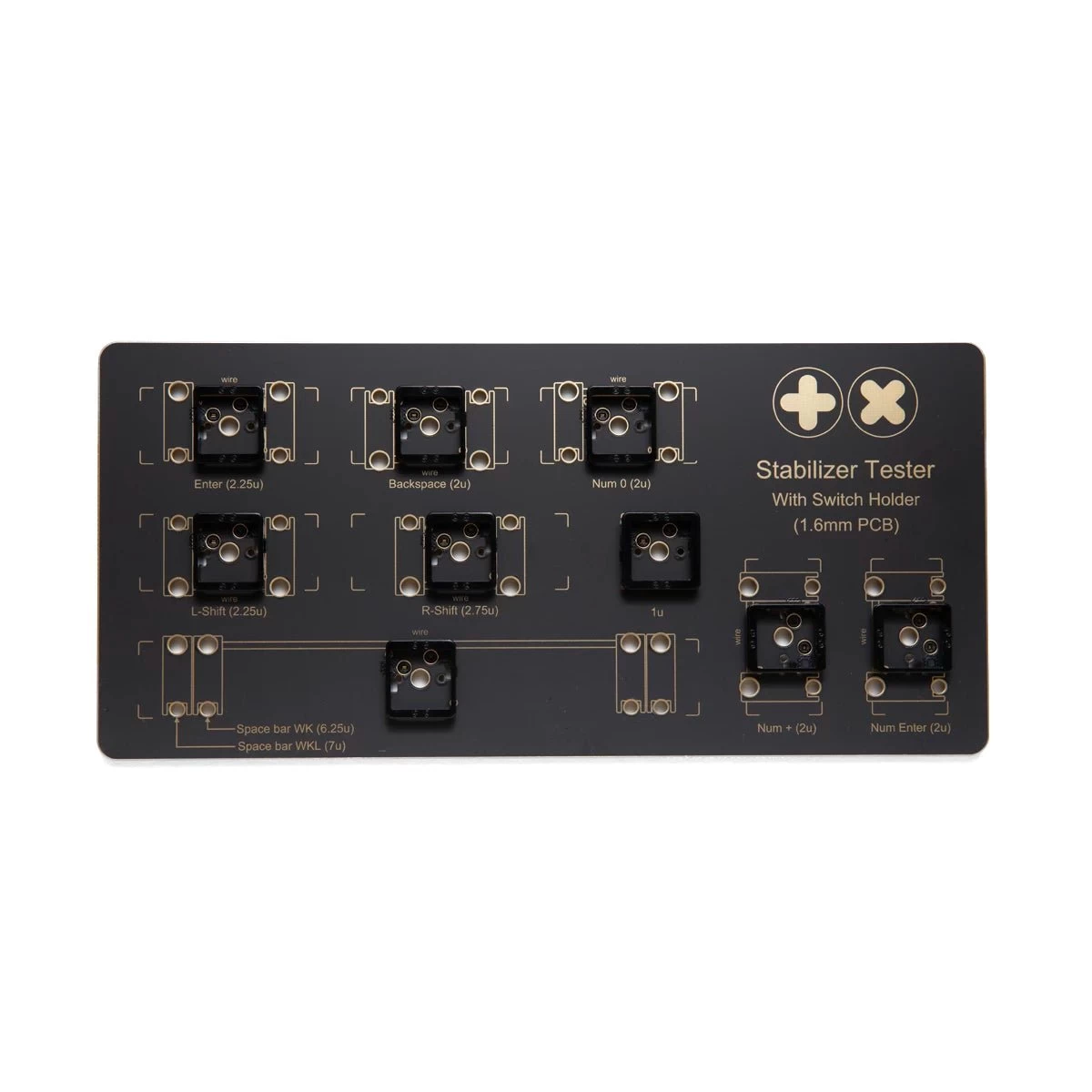TX Stabilizer Tester with Switch Holders are now larger and more intuitive than the normal switch testers. With switch holding brackets installed to keep the switch in place to better simulate how the stabilizers will perform as well as installed hotswap sockets and bumpons.